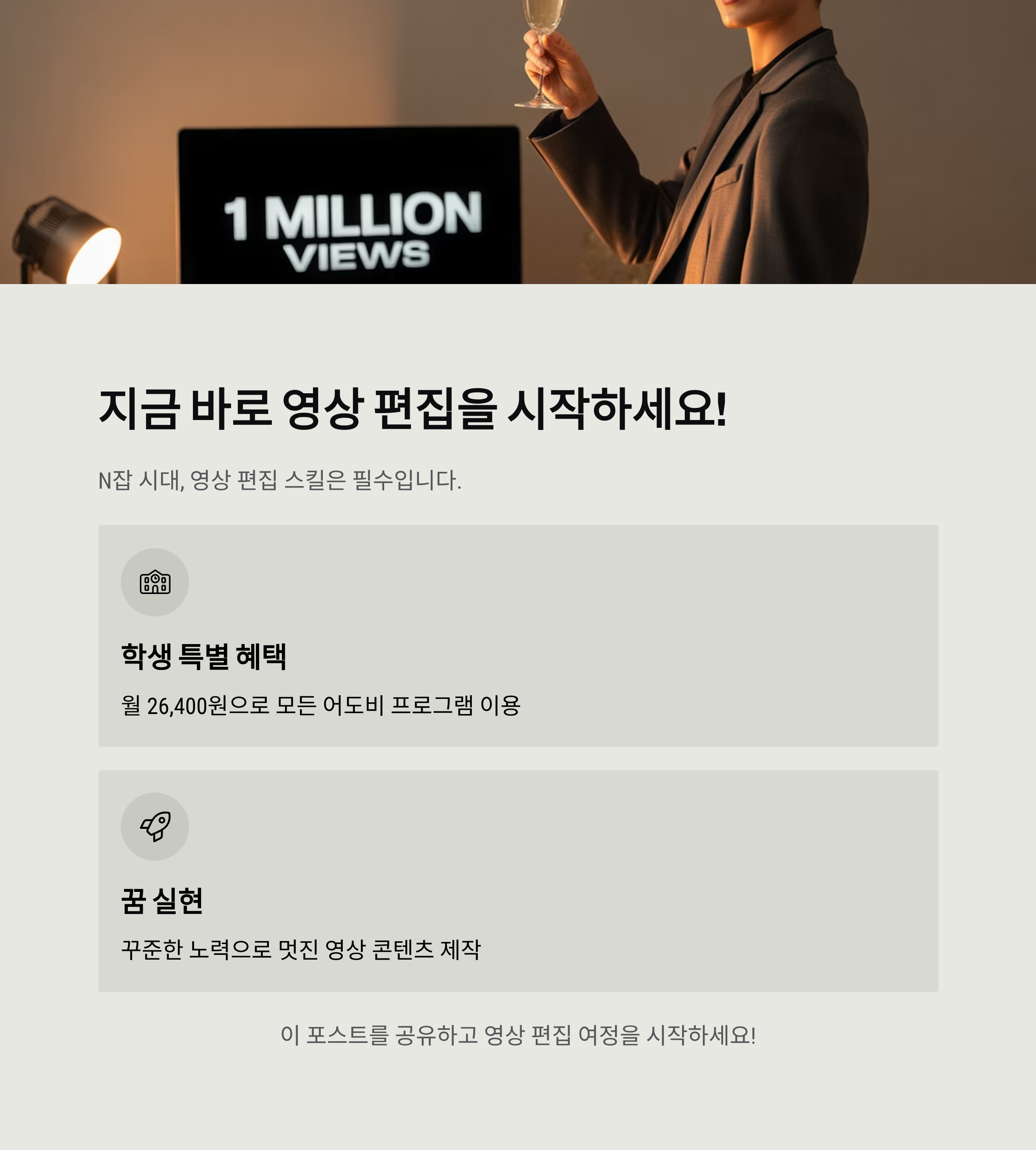 어도비는 학생들을 위해 특별한 할인 혜택을 제공합니다. 프리미어 프로 단일 구독보다 저렴한 월 26,400원으로 어도비 익스프레스, 포토샵, 프리미어 프로를 모두 사용할 수 있는 크리에이티브 클라우드 학생 플랜을 활용해 보세요. 영상 편집 프로그램 하나로 수익을 창출하고 마케팅 전문가로 성장할 수 있는 기회입니다!